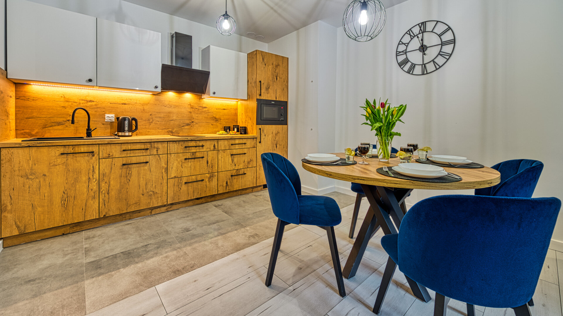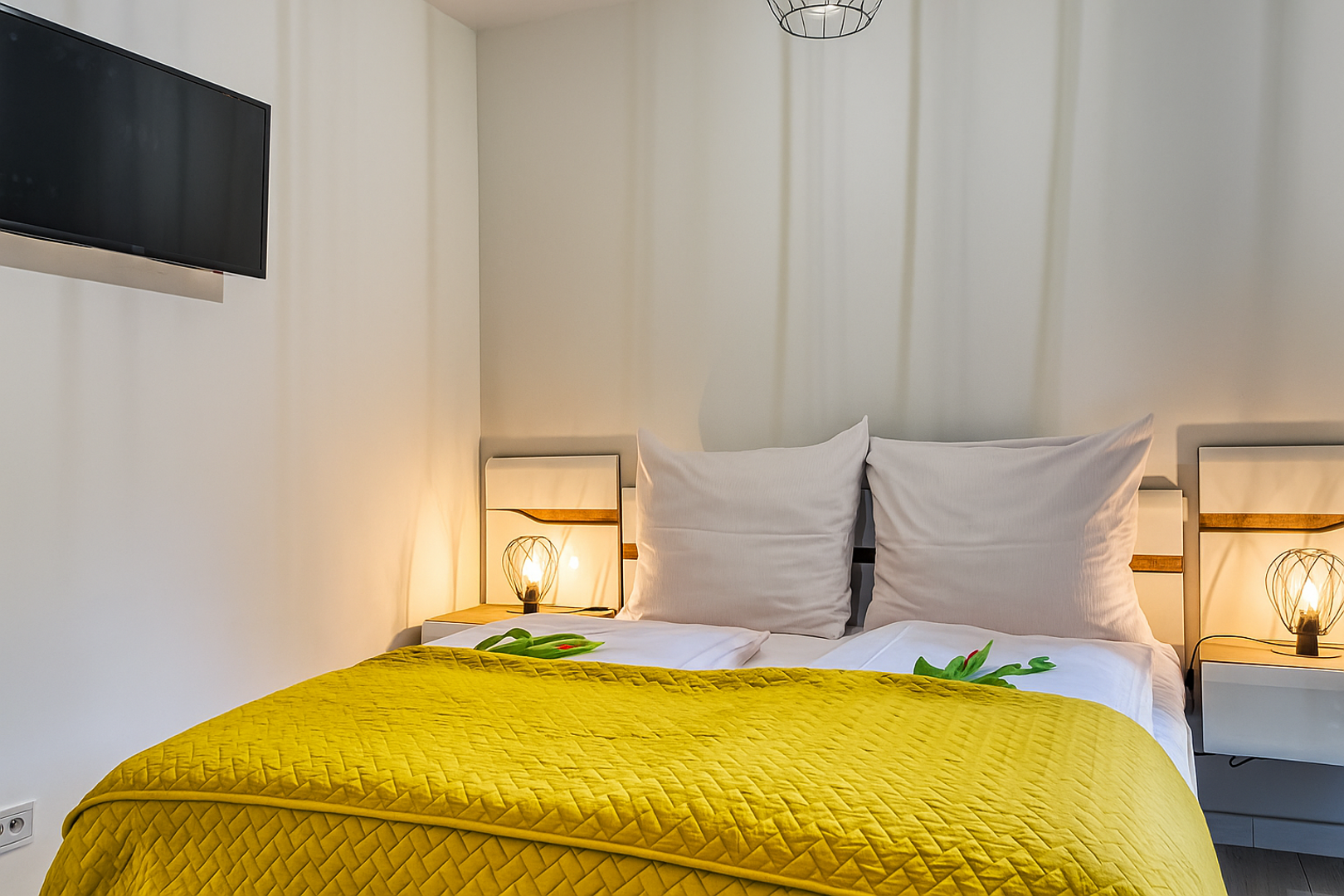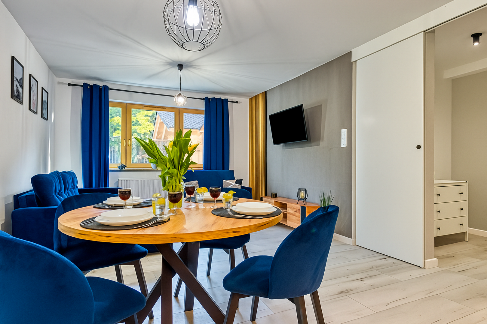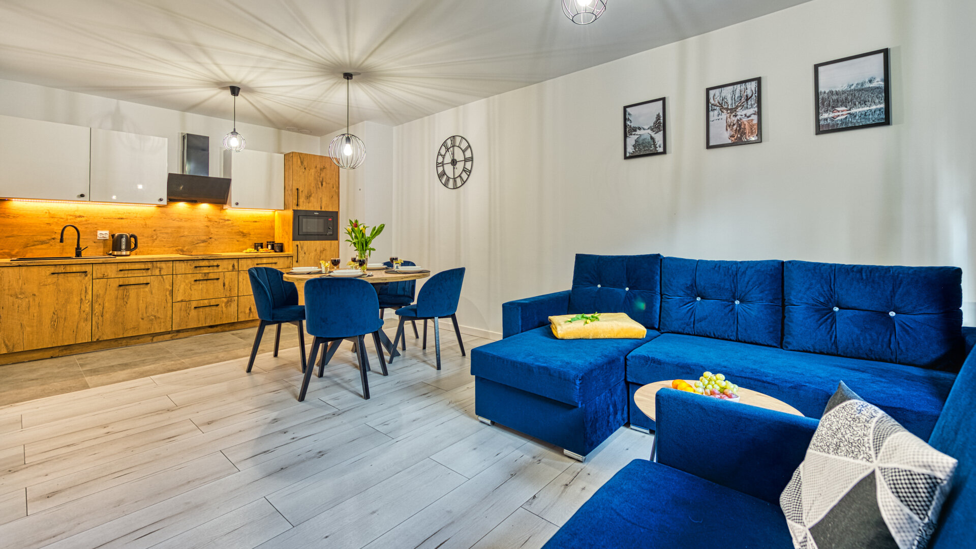 Apartament przeznaczony jest dla maksymalnie 5 osób i składa się z komfortowej sypialni z dużym łóżkiem małżeńskim oraz przestronnego salonu z rozkładanym narożnikiem i rozkładanym fotelem. Jasne wnętrza, ciepłe kolory i nowoczesne wykończenie tworzą przyjemną , domową atmosferę.