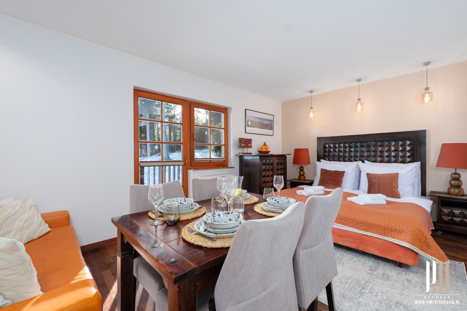 Apartament typu studio dla 4 osób. Jednopokojowy apartament z łóżkiem małżeńskim oraz rozkładanym narożnikiem. Na wyposażeniu aneks kuchenny oraz prywatna łazienka. Idealny dla pary lub rodziny.