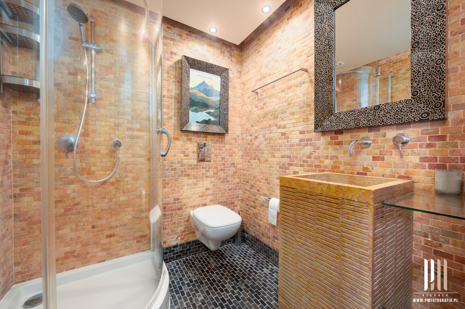 Elegancka łazienka wyposażona w kabinę prysznicową, umywalkę, toaletę, a także suszarkę do włosów, komplet ręczników – wszystko, czego potrzeba do codziennej pielęgnacji.