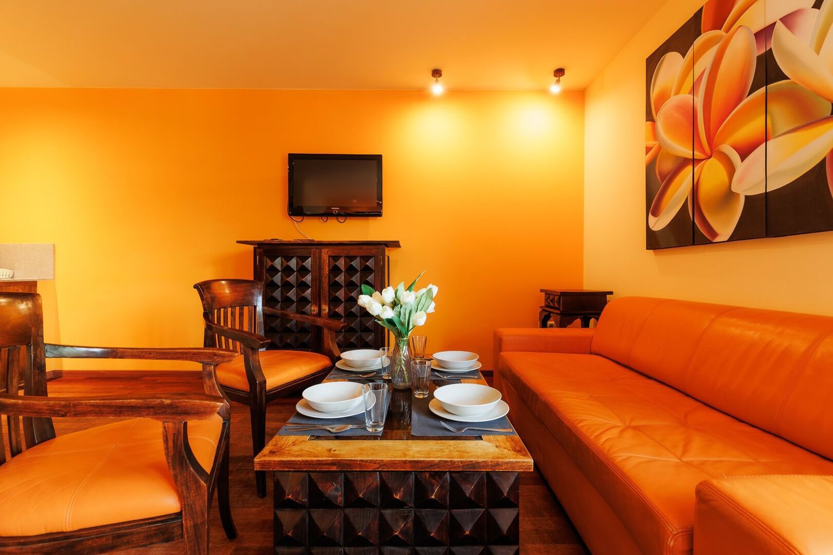 W apartamencie znajduje się przytulna część wypoczynkowa z wygodną sofą oraz telewizorem z płaskim ekranem – doskonałe miejsce na relaks po dniu pełnym atrakcji. Przestrzeń ta połączona jest z funkcjonalnym aneksem kuchennym, wyposażonym w płytę grzewczą, mikrofalówkę, komplet naczyń i przybory kuchenne – wszystko, czego potrzeba do przygotowania domowych posiłków.