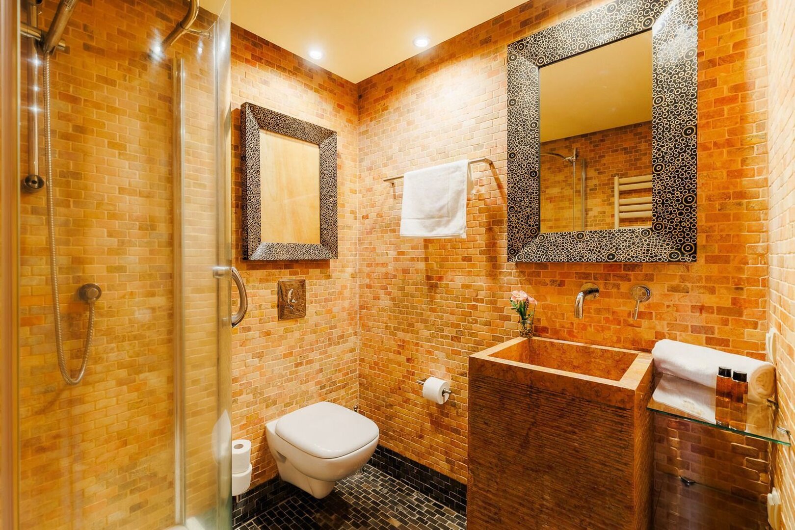 Nowoczesna łazienka oferuje przestronny prysznic, umywalkę, toaletę oraz suszarkę do włosów.