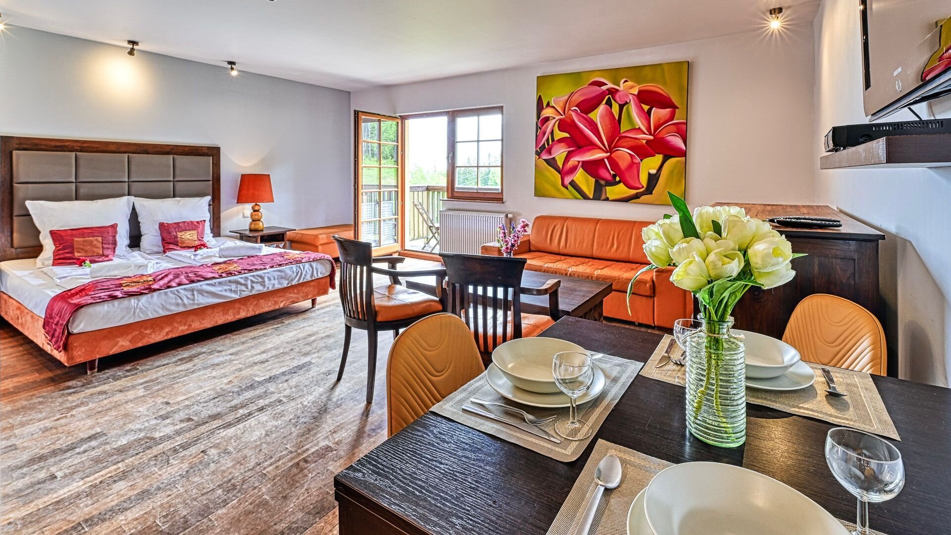 Przytulny apartament z balkonem, inspirowany naturą. Do dyspozycji gości bezpłatna sauna i pokój zabaw dla dzieci.