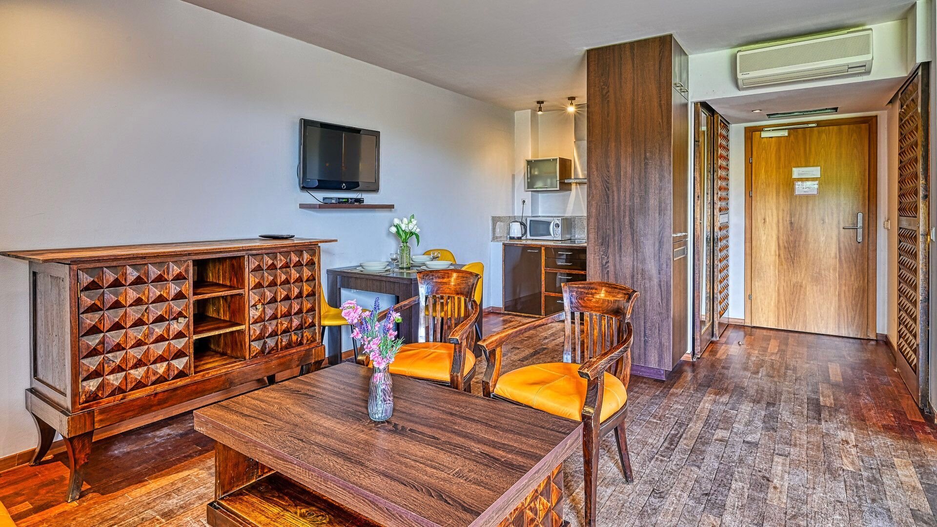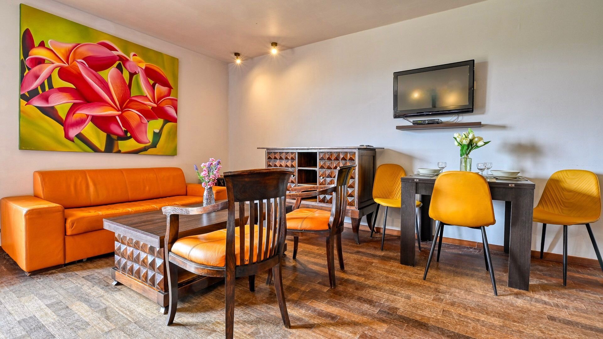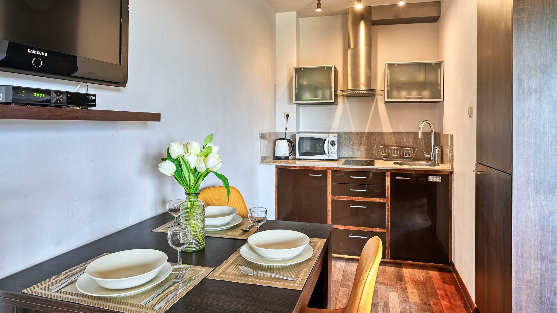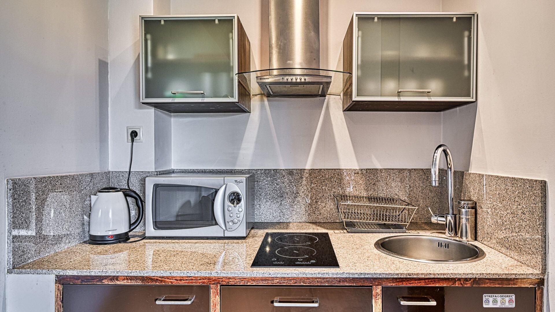 W apartamencie znajduje się przytulna część wypoczynkowa z wygodną sofą oraz telewizorem z płaskim ekranem – doskonałe miejsce na relaks po dniu pełnym atrakcji. Przestrzeń ta połączona jest z funkcjonalnym aneksem kuchennym, wyposażonym w płytę grzewczą, mikrofalówkę, komplet naczyń i przybory kuchenne – wszystko, czego potrzeba do przygotowania domowych posiłków.