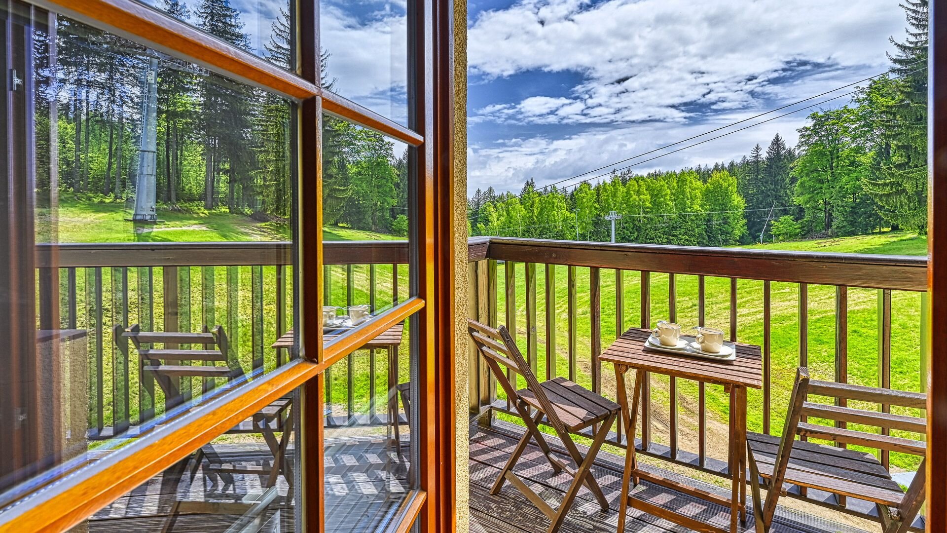 Dwupoziomowy apartament z balkonem i widokiem na stok, panoramę, Wysoki Kamień oraz góry. Do dyspozycji Gości: 2 sypialnie, salon, 2 łazienki oraz balkon.