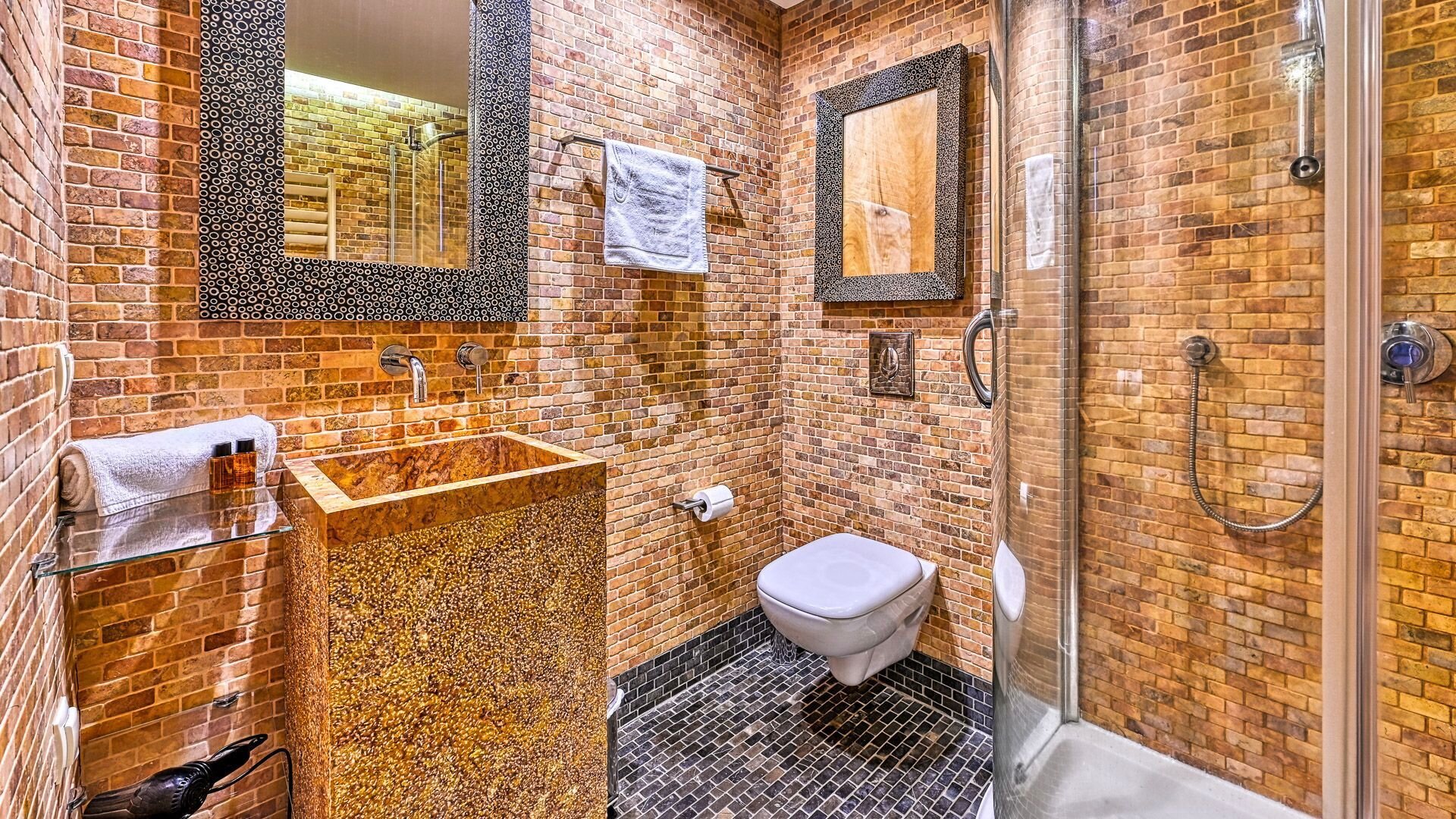 Nowoczesna łazienka oferuje przestronny prysznic, umywalkę, toaletę oraz suszarkę do włosów.