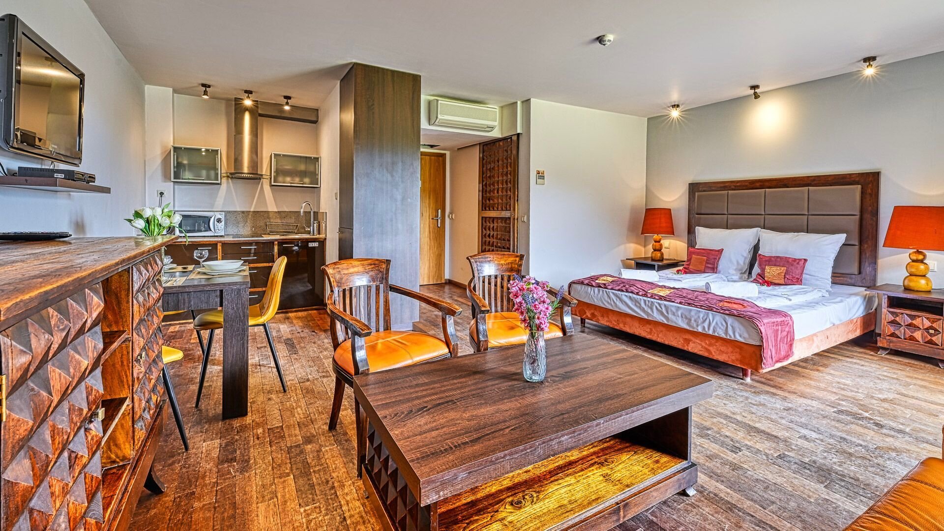 Apartament typu studio dla 4 osób. Jednopokojowy apartament z łóżkiem małżeńskim oraz rozkładanym narożnikiem. Na wyposażeniu aneks kuchenny oraz prywatna łazienka. Idealny dla pary lub rodziny.